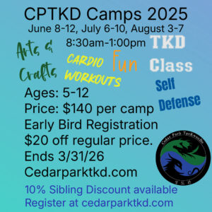 Welcome to the Cedar Park TaeKwonDo home page. We will be adding content often as we get pages built for registration, scheduling, and other features on the site. If you don’t see answers to your questions, please go to the Contact Us page to ask us any questions you have and we will reply promptly. Thank you and have a great day!!